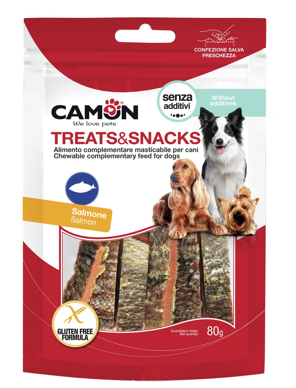 Deliziosi snack a forma di strips con salmone, uno sfizioso spuntino ricompensa per il cane.