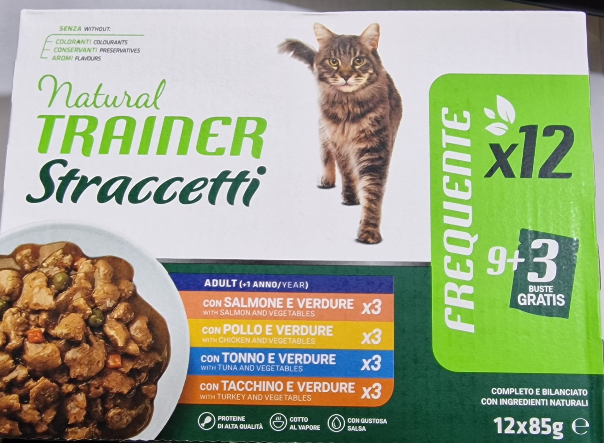 Con ingredienti Naturali; Senza coloranti, conservanti o aromi artificiali; Con proteine di Alta qualità; Con verdure in pezzi; Nel multipack troverete tutti e 4 i gusti Pollo/verdure, Tacchino/verdure, Salmone/verdure e Tonno/verdure.