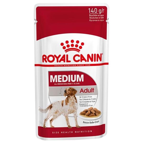 Royal Canin Medium Adult è confezionato in pratiche bustine di 140 g, ideali per essere somministrate come alimento completo o per arricchire la dose giornaliera di crocchette.