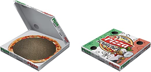 Divertente forma di pizza: il layout ricorda i cartoni della pizza da asporto e una volta aperto la parte graffiabile ricorda una vera pizza