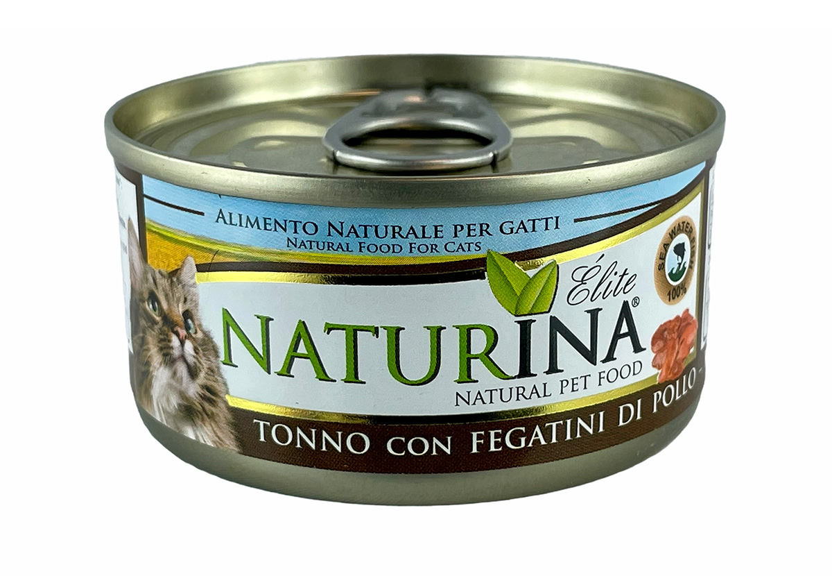 NATURINA ELITE TONNO con FEGATINI di POLLO è un alimento complementare per gatti adulti al naturale: cucinato al vapore e conservato in acqua di cottura (no gelatina). Realizzato con parti pregiate di tonno e fegatini di pollo.