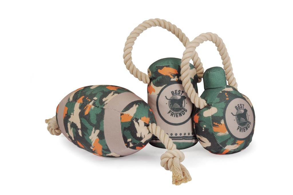 Selezione di giochi assortiti, caratterizzati dalla presenza dello squeaker interno e della maniglia in cotone.
