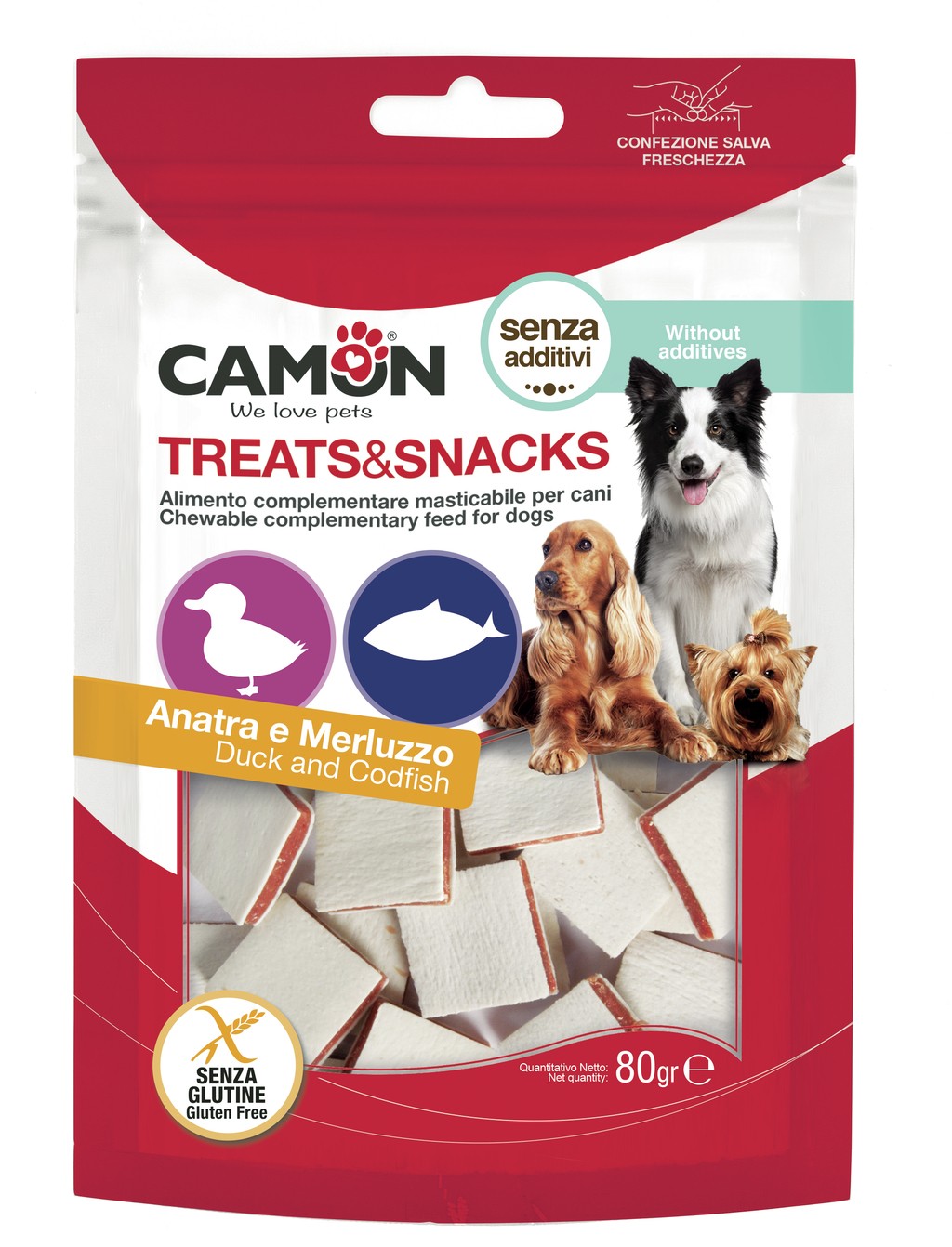 Deliziosi spuntini ricompensa per cani adulti a base di anatra e merluzzo.