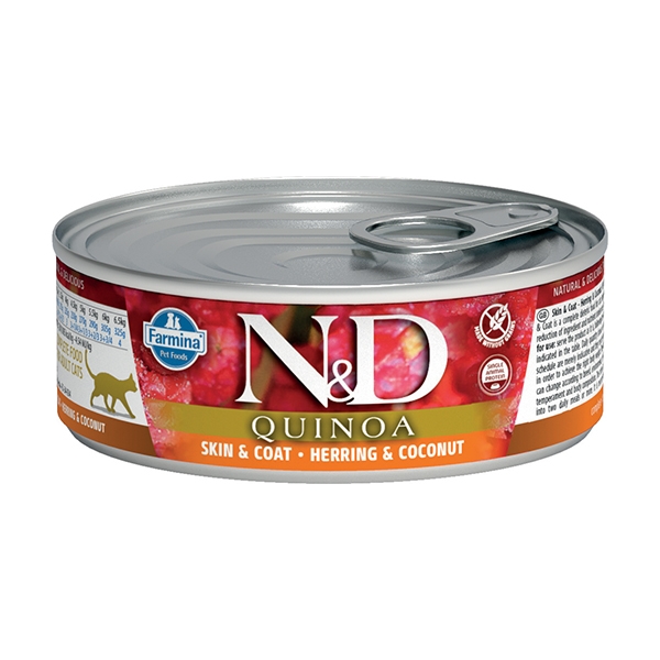 N&D Quinoa Skin & Coat è un alimento dietetico completo per gatti, consigliato per la riduzione di intolleranze a ingredienti e sostanze nutritive.