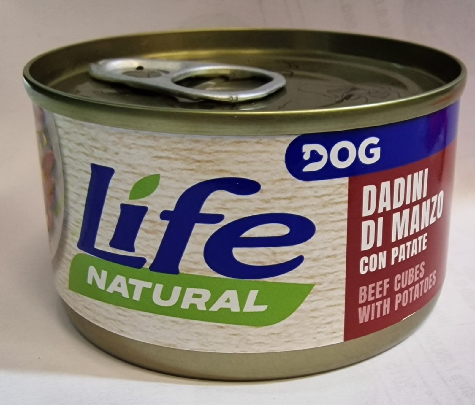 Dadini di polpa di manzo con patate tagliate a cubetti, conservati in salsa vegetale.È un alimento molto gustoso, si può offrire al cane da solo o mischiato con crocchette secche per renderle più appetibili.La carne di manzo è ricca di proteine di elevato valore biologico, minerali e vitamine.Le patate apportano un buon contenuto di carboidrati.Senza aggiunta di coloranti, conservanti, cereali e additivi.
