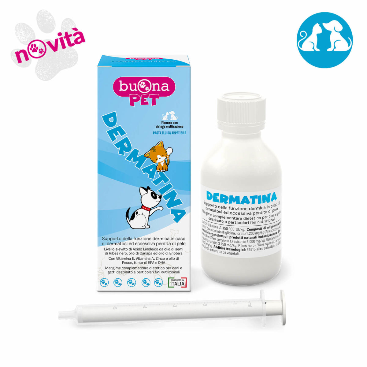 DERMATINA FLACONE è formulato in pasta appetibile con un livello elevato di Acido Linoleico da oli vegetali (olio di semi di Ribes nero, Canapa, Enotera), somma di acido eicosapentaenoico (EPA) e di acido docosaesaenoico (DHA), ed estratti di Olivo, Bardana e Ribes. Il contenuto in Vitamina E, Vitamina A e Zinco favorisce il normale trofismo di cute ed annessi cutanei. L’utilizzo della siringa multirazione consente un’accurata e facile somministrazione quotidiana.