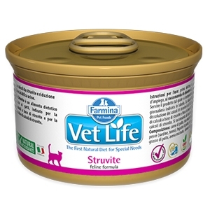Dissoluzione calcoli da struvite e riduzione delle recidive. Acidifica urine.Farmina Vet Life Struvite è un alimento dietetico completo destinato ai gatti, indicato per la dissoluzione di calcoli a base di struvite e per la riduzione delle recidive di calcoli di struvite.Istruzioni per l’uso: prima dell'uso, e prima di estendere il periodo d’impiego, si raccomanda di chiedere il parere del medico veterinario. Servire il prodotto tal quale e a temperatura ambiente seguendo la quantità giornaliera indicata in tabella. La durata del trattamento dietetico per la dissoluzione dei calcoli di struvite è di 5-12 settimane in caso di dissoluzione di calcoli a base di struvite e fino a 6 mesi in caso di riduzioni delle recidive di calcoli di struvite. Si raccomanda di lasciare sempre acqua fresca a volontà.COMPOSIZIONE