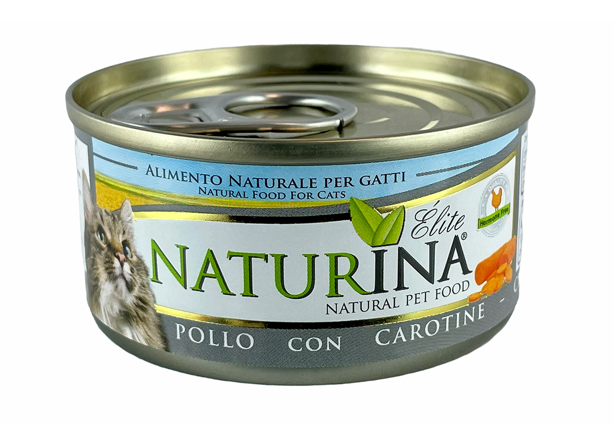 NATURINA ELITE POLLO con CAROTINE è un alimento complementare per gatti adulti al naturale: cucinato al vapore e conservato in acqua di cottura (no gelatina). Realizzato con filetti di petto di pollo e carotine.