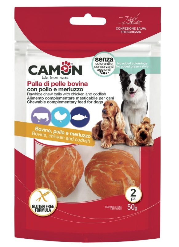 Deliziosi snack a forma di palla di pelle bovina con pollo e merluzzo, uno sfizioso spuntino ricompensa per cani adulti.