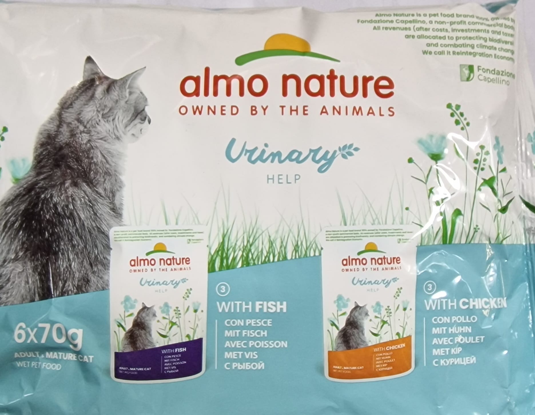 Almo Nature Urinary Help è l’alimento umido completo formulato con mirtilli rossi che contribuiscono al buon funzionamento del sistema urinario, mentre la presenza di DL Metionina funge da acidifcante urinario. Arricchite con vitamine e minerali, senza utilizzare coloranti o conservanti chimici, le ricette Almo Nature Urinary Help favoriscono una naturale idratazione e sono ideali per gatti adulti con sensibilità urinaria. La confezione in plastica riciclabile e la bustina poliaccoppiata di plastica ed alluminio, scelta per la corretta conservazione del prodotto, se smaltite correttamente possono essere riutilizzate rispettivamente come materia prima per altri imballi e per produrre energia. Almo Nature Urinary Help MultiPack - deliziosi bocconcini in salsa – disponibili in due gusti in una comoda confezione da 6 bustine da 70 g. Almo Nature è il brand attivista 100% proprietà della Fondazione Capellino.