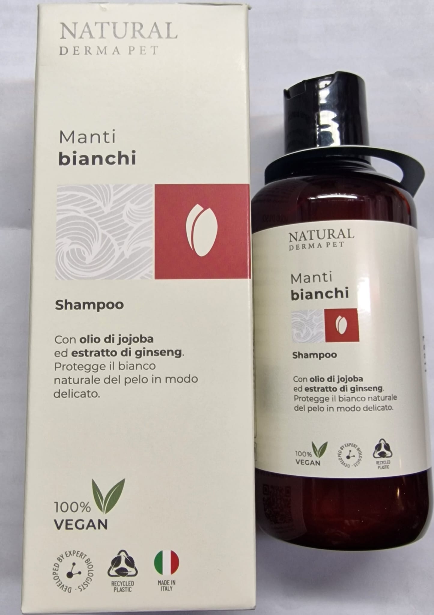 La formulazione per Manti Bianchi rispetta e protegge il bianco naturale del pelo in modo delicato e non aggressivo. Olio di Jojoba: le proprietà di quest’ olio sono apprezzabili per l’ elevata purezza, per l’assenza di odore, per la stabilità al calore e per l’alta resistenza all’irrancidimento oltre che per la presenza di antiossidanti naturali: i tocoferoli. Il suo utilizzo si raccomanda in tutti i casi che richiedono nutrimento e protezione del manto. Ottimo per ridensificare la struttura del pelo bianco. Biossido di titanio: è una polvere cristallina tendente al bianco. Protegge dalla radiazione solare di tipo A, contribuendo a mantenere il colore bianco del pelo. Estratto di ginseng: possiede la proprietà di potenziare il trofismo cutaneo contribuendo a tonificare e ossigenare i tessuti. Stimola la circolazione sanguigna.
